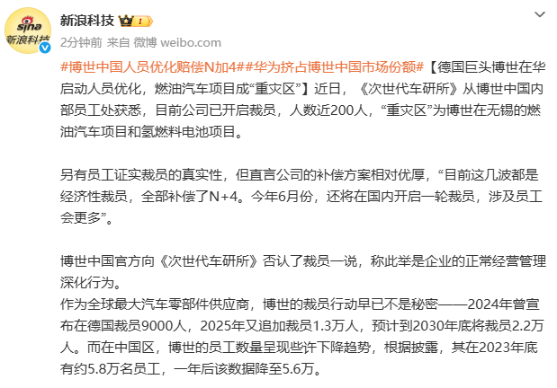 【CNMO科技音书】据“新浪汽车”报谈,群众汽车零部件巨头博世在中国市集启动东谈主员优化有策画,触及无锡工场燃油汽车及氢燃料电板技俩团队,首批裁人范畴近200东谈主。据里面职工骄贵,这次转机以经济性裁人为主,受影响职工可得到“N+4”抵偿决策,另有音书称本年6月将启动更大范围裁人。