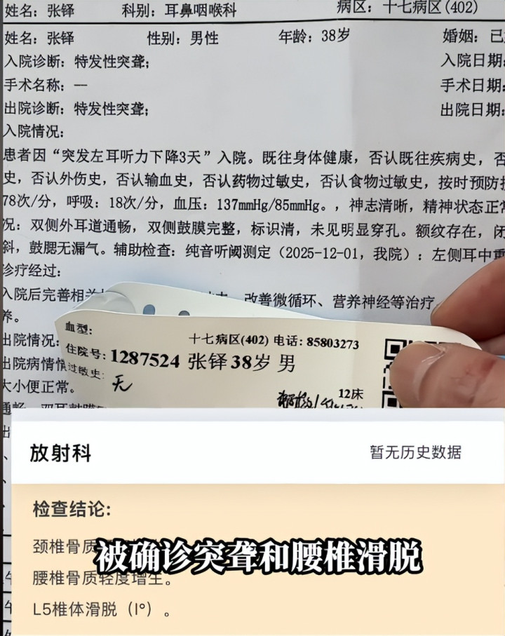 去病院一查,大夫拿着确认单,色彩挺严肃:耳聋,腰椎滑脱。